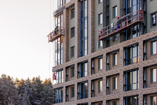 Жилой комплекс «Дабл-Дабл» гармонично сочетает урбанистическую эстетику и элегантную сдержанность. На фасадах — штукатурка натуральных пастельных и глубоких тёмных оттенков с декором из руста. Вертикальные линии панорамных окон добавляют зданиям выразительности и динамики